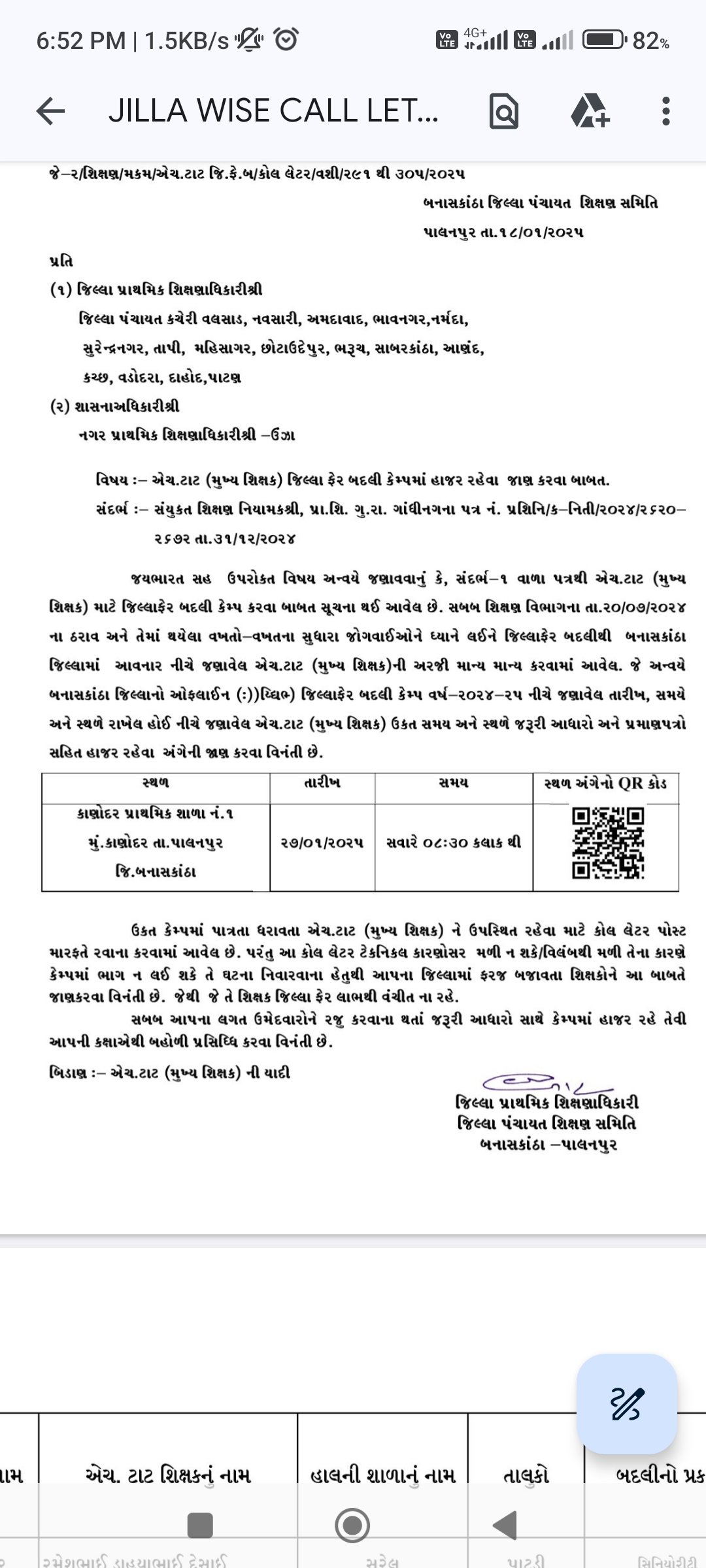 જયભારત સહ ઉપરોકત વિષય અ-વયે જણાવવાનું કે, સંદર્ભ-૧ વાળા પત્રથી એચ.ટાટ (મુખ્ય શિક્ષક) માટે જિલ્લાફેર બદલી કેમ્પ કરવા બાબત સૂચના થઈ આવેલ છે. સબબ શિક્ષણ વિભાગના તા.૨૦/૦૭/૨૦૨૪ ના ઠરાવ અને તેમાં થયેલા વખતો-વખતના સુધારા જોગવાઈઓને ધ્યાને લઈને જિલ્લાફેર બદલીથી બનાસકાંઠા જિલ્લામાં આવનાર નીચે જણાવેલ એચ.ટાટ (મુખ્ય શિક્ષક)ની અરજી માન્ય માન્ય કરવામાં આવેલ. જે અન્વયે બનાસકાંઠા જિલ્લાનો ઓફલાઈન (:))લ્લિજિલ્લાફેર બદલી કેમ્પ વર્ષ-૨૦૨૪-૨૫ નીચે જણાવેલ તારીખ, સમયે અને સ્થળે રાખેલ હોઈ નીચે જણાવેલ એચ.ટાટ (મુખ્ય શિક્ષક) ઉકત સમય અને સ્થળે જરૂરી આધારો અને પ્રમાણપત્રો સહિત હાજર રહેવા અંગેની જાણ કરવા વિનંતી છે.